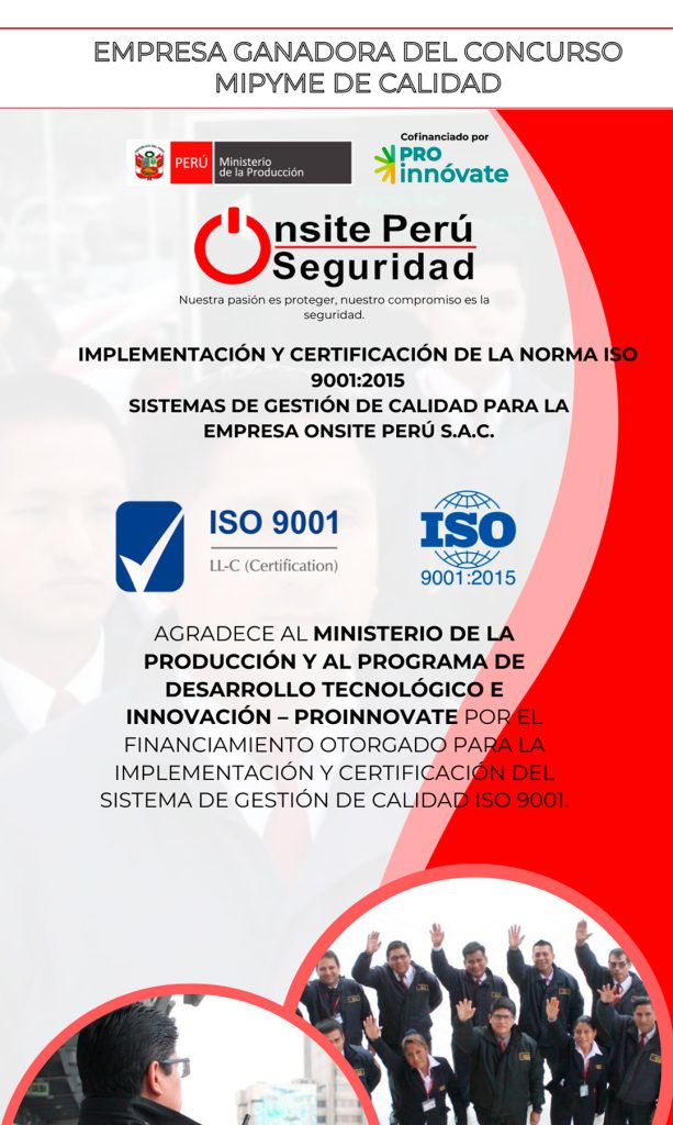 La empresa ONSITE PERÚ S.A.C., con RUC 20514343153, ha alcanzado esta prestigiosa certificación gracias al apoyo del programa nacional del Ministerio de la Producción, Innóvate Perú (actualmente Pro Innóvate). Esta certificación respalda nuestros servicios de vigilancia privada con y sin arma a nivel nacional.