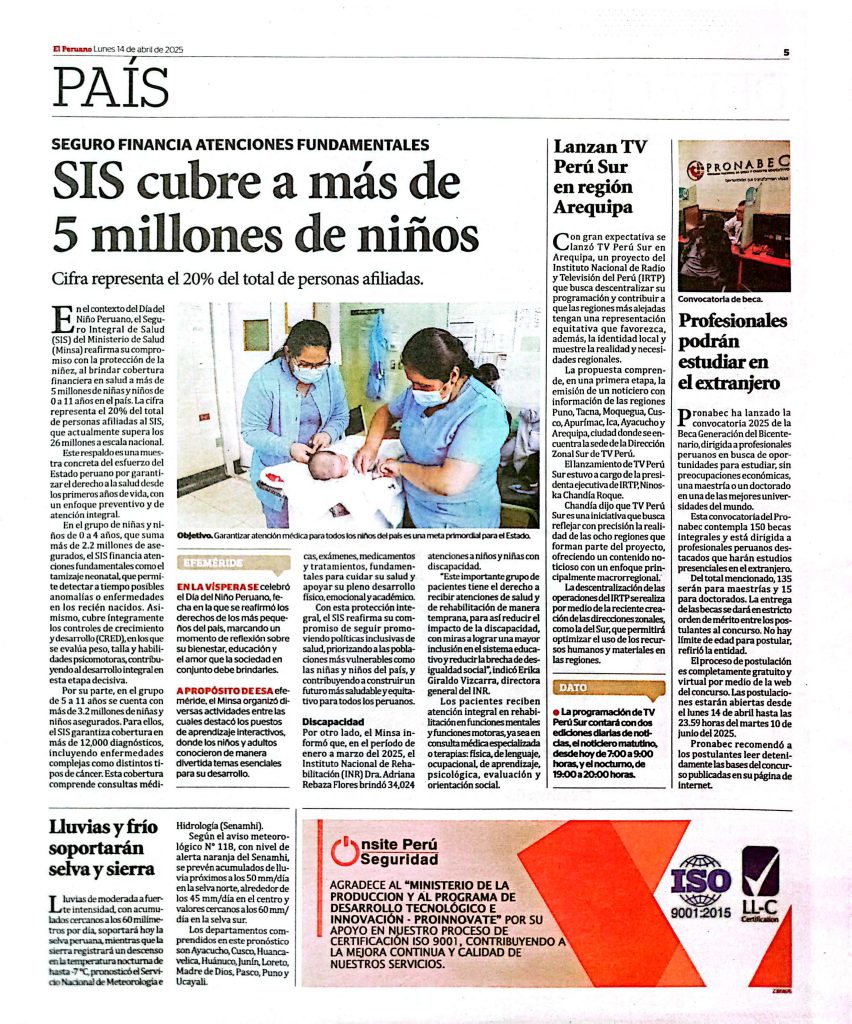 Nuestra publicidad en el periódico El Peruano, sobre la obtención del certificado ISO 9001, con la financiación de ProInnovate y El Ministerio de la Producción